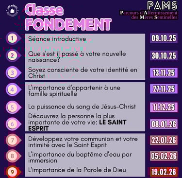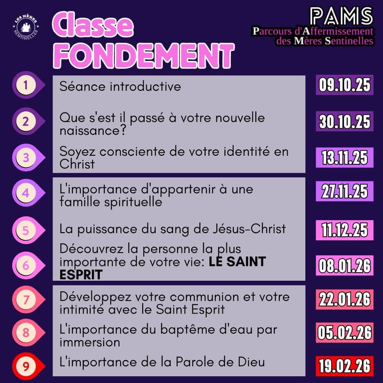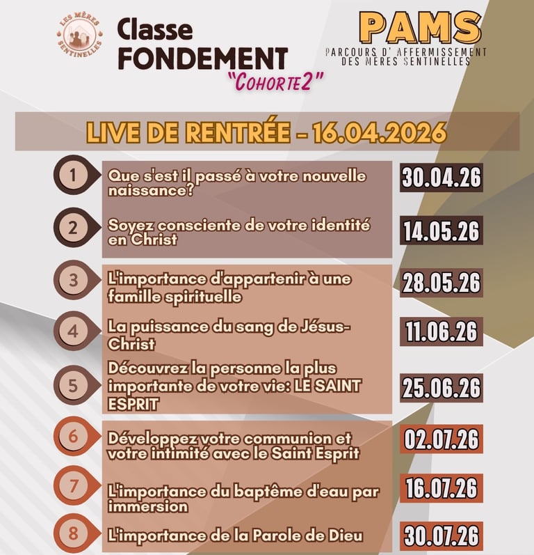 Afin de les aider à grandir en Christ afin de devenir à leur tour des disciples de Jésus-Christ, nous lançons le 𝐏𝐀𝐌𝐒 (𝐏𝐀𝐑𝐂𝐎𝐔𝐑𝐒 𝐃'𝐀𝐅𝐅𝐄𝐑𝐌𝐈𝐒𝐒𝐄𝐌𝐄𝐍𝐓 𝐝𝐞𝐬 𝐌È𝐑𝐄𝐒 𝐒𝐄𝐍𝐓𝐈𝐍𝐄𝐋𝐋𝐄𝐒)